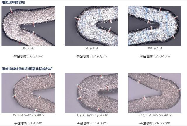 经过吉川公司工艺工程师测试,用氧化铝砂进行定向的喷砂处理可以去除氧化层,平滑表面缺陷并改善外围支架的表面质量。支架的受损区域很脆,但基础材料镍钛诺却具有延展性。氧化铝喷砂磨料使用去氧化层,并且对韧性基体的侵蚀最小,从而在支架撑杆的整个长度上形成均匀的表面光洁度。 市场最新的支架设计和医疗植入物要求更大的边缘倒圆角。圆形边缘降低了被植入物卡住,其他风险的可能性。氧化铝微喷丸的半径为5-15 m,但新的几何尺寸指定为接近25 m。该半径可以通过三种途径实现:延长喷砂周期,使用更大尺寸的氧化铝或完全使用其他磨料。通过测试,我们了解到更长的喷砂周期可以去除更多的团块,而较大尺寸的氧化铝会产生过于粗糙而无法抛光的表面。毕竟,氧化铝颗粒的形状为块状,边缘稍尖。这给了我们一个可行的选择:尝试使用其他类型的磨料。为了克服这一障碍,我们测试了几种类型的介质,发现用玻璃珠喷砂可以在拐角处形成所需的半径(最大30 m),而不会除去设备的额外质量。结果是氧化铝的质量提高了十倍。经过吉川公司工艺工程师的测试事实说明了结果的差异。用氧化铝喷砂处理过的样品的半径仅为8-13 m,而用玻璃珠喷砂处理过的样品的半径为24-30 m。 经过吉川公司工艺工程师最终测试事实证明,最好的心脏支架喷砂工艺需要用氧化铝砂粗喷砂、再用玻璃珠微喷砂是目前最好的一种喷砂工艺方式。 经过粗喷、微喷的产品外径和内径转角处的半径可以实现,而所需的附加材料去除最少。半径的大小可以有效地控制,因为它是基于圆形磨料,玻璃珠的大小和速度的。可以控制具有附加半径的支架区域。通过机械加工表面,有助于保持支架的疲劳寿命。玻璃珠磨料通常用于必须保持严格公差的喷丸处理应用中。玻璃珠对支架表面进行喷丸处理,不会去除任何材料或数量可忽略不计的材料。如下所示,玻璃珠的尺寸很重要。玻璃珠的尺寸越大;边缘越圆。玻璃珠有35 ,50 和100 两种。让我们看一下使用每种尺寸的样本测试的结果。此处显示的未喷砂的支架表面(500x)边缘锋利,并受到制造损坏。半径范围仅为3-8 m。为什么用两种磨料处理比单独用氧化铝处理好? 玻璃珠无法消除制造过程中产生的浮渣,回弹和其他损坏;只有氧化铝可以。氧化铝不能产生真正的圆形边缘。但是,它确实可以提供电抛光所需的理想表面光洁度。一个不能替代另一个。通过使用多步骤过程,植入物表面可以使用经过验证的相同设备获得两全其美的效果。在该过程中添加第二种研磨剂听起来可能需要更多的劳动力,但实际上比其他修边过程更有效。例如,电抛光可以产生较大的半径,但它也会从整个零件中去除过多的材料,而不仅仅是角部,从而损害了支架的疲劳寿命。